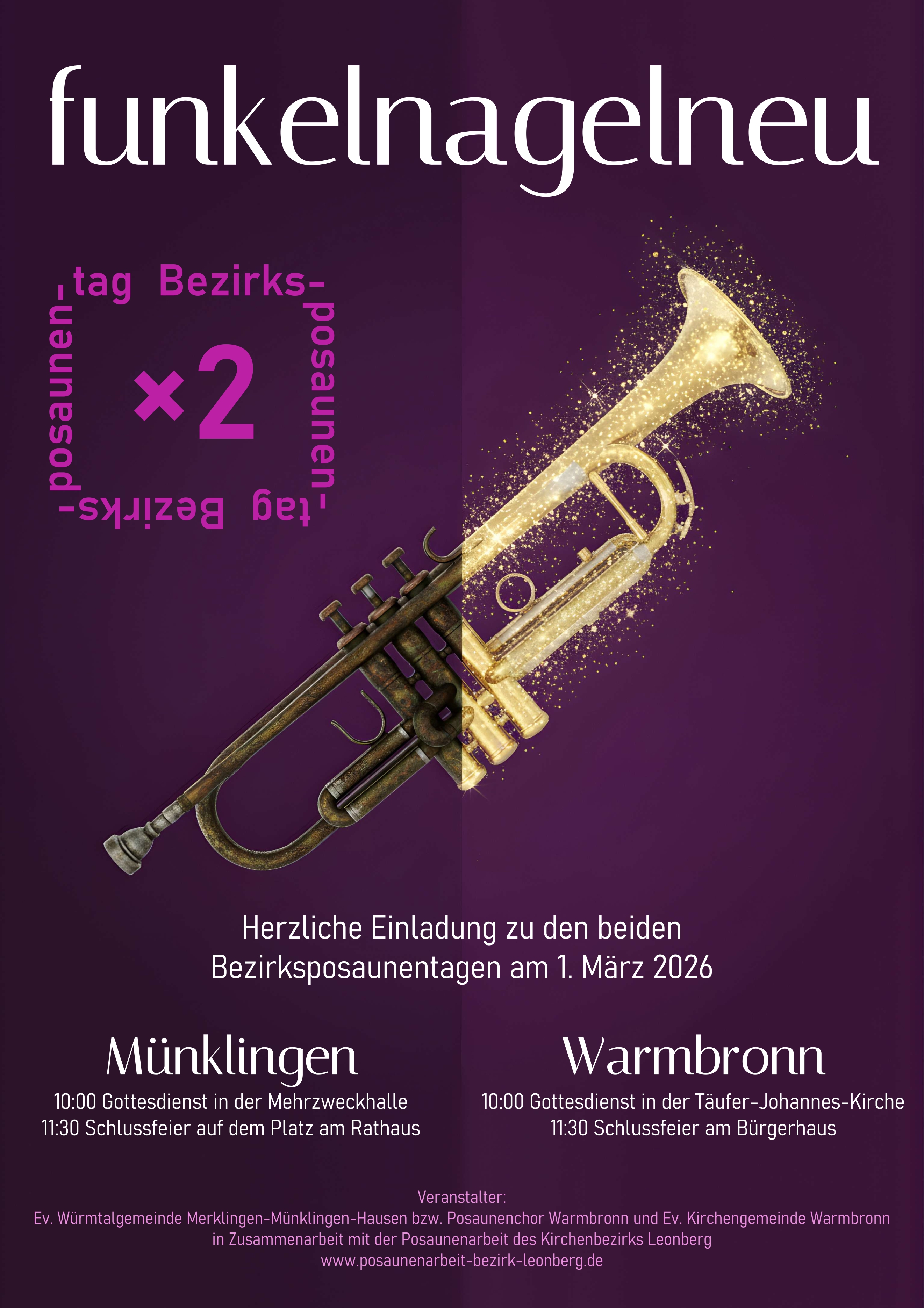 Herzliche Einladung zu den beiden Bezirksposaunentagen (genauer Teilbezirksposaunentagen) am 1. März 2026 in Warmbronn und Münklingen. Das Motto ist „funkelnagelneu“, in Anlehnung an die Jahreslosung 2026: „Gott spricht: Siehe, ich mache alles neu!“ (Offenbarung 21,5)